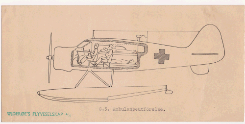 | Reklamekort med tegning af ambulancefly stemplet Widerøe's Flyveselskab C.5. Ambulanseutförelse |