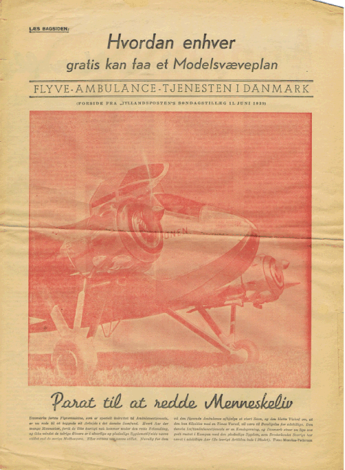 | Fire-sidet brochure trykt på avispapir og opsat som avis i BT-format med reklame for Flyve-ambulance-Tjenesten |