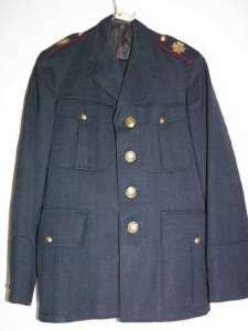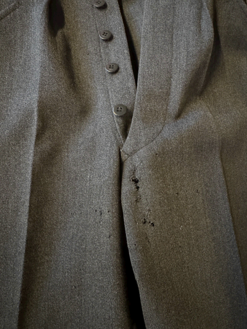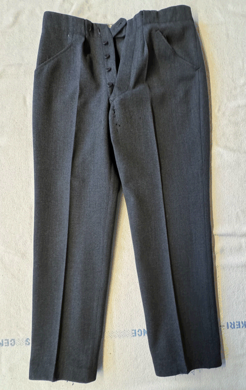 Uniformsjakke med broderede skuldermærker, fire store malteserknapper til lukning, små på ærmer og lommer. Til uniformen hører et par lange bukser i samme grå stof som jakken. |