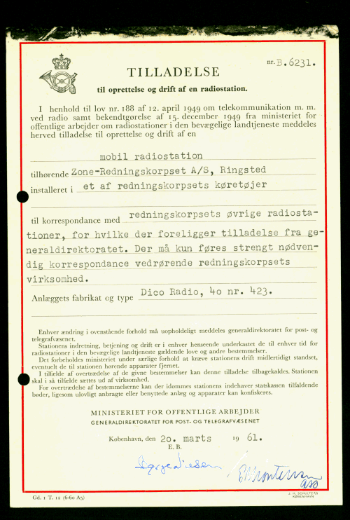 | Tilladelse til oprettelse og drift af en Dico Radio radiostation udstedt af Post- & Telegrafvæsenet til ZR Ringsted i sort og rødt tryk |