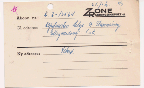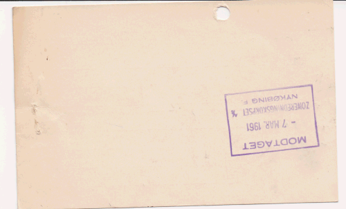 | Hvidt udfyldt kort med Zonens logo til notering af ny adresse på abonnent stemplet modtaget i Nykøbing F. den 7. marts 1961 |