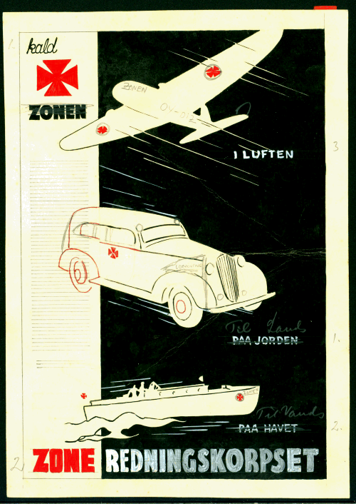 | Originalt udkast til grafisk opsætning af budskabet om Zonen Til Lands Til Vands og I Luften formuleret Zonen I Luften, Paa Jorden, Paa Havet med motiver af fly, bil og båd udført i farverne rød, hvid og sort på papark. På flyet er med blyant anført OY-DIZ og med blyant er Zonens rette udtryk Til Lands Til Vands I Luften udført som overstregning af Paa Jorden og Paa Havet |