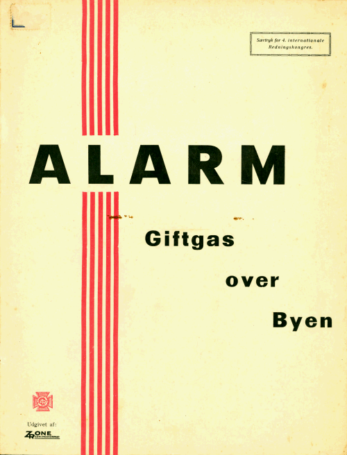 | Alarm - Giftgas over Byen - Tryksag til 4. internationale redningskongres 1934 i sort og rødt tryk med uddrag af Jens Ervø [red]: Giftgas over Byen: Civilbefolkningens Beskyttelse under den næste Krig. Sagkyndige Udtalelser om et Samfundsspørgsmaal, som ethvert Menneske uden Hensyn til partipolitiske Anskuelser i egen Interesse bør sætte sig grundigt ind i. Nyt Nordisk Forlag. Arnold Busck, 1933 |
