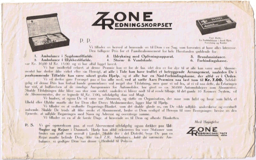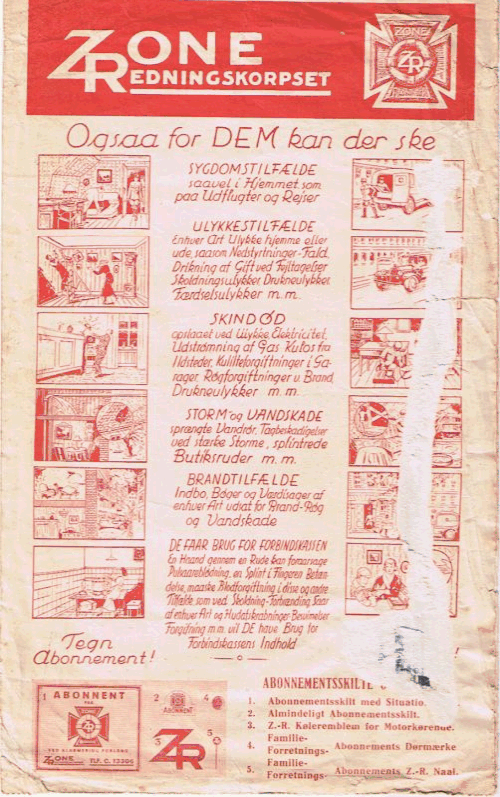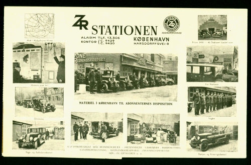 4-fløjet brochure på hvidt papir i sort og rødt tryk med reklame for abonnement i forbindelse med stationen på Harsdorffsvej 8, dateret 1933. Forside og bagside i rødt tryk. Forside fra en forbindskasse, bagside med tegninger af ulykker m.v.. Fotos i brochure findes for de flestes vedkommende i samlingen |