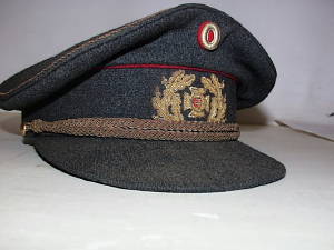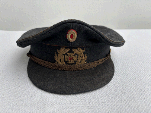 Grå Zoneleder kasket med stofskygge, bred dobbelt guldsnor, vævet maltzerkors i egeløv. Oval kokarde. Mærket Garodkin Gammel Kongevej 91 Kbhn. |