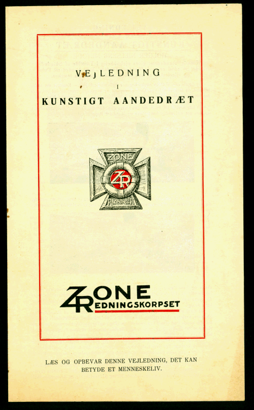 | Foldet vejledning i kunstigt åndedræt efter Holger Nielsen Metoden med demonstrationsfotos af Lyngby Sørensen i sort og rødt tryk. Variant af 3343T1ZMZR med rødt tryk under logo på forsiden og ændret logoopsætning mv. på bagsiden med københavnske telefonnumre |