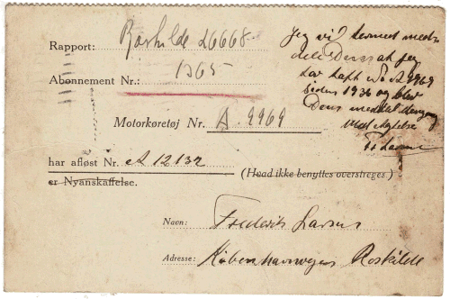 | Blanket adresseret til Zonen Eskilstrup om skift af motorkøretøj omfattet af abonnement stemplet modtaget hos Zonen Eskilstrup den 9. januar 1941 |