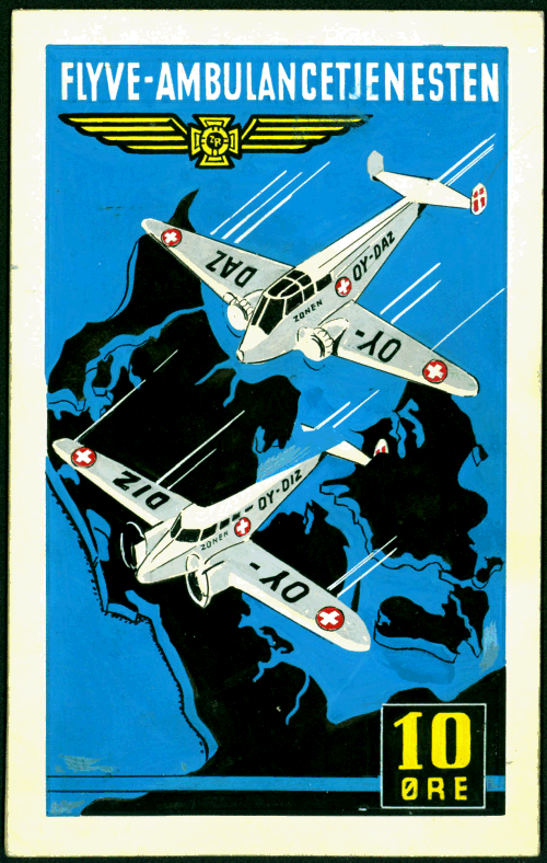 | Original tegning, forlæg til mærkat med pris 10 Øre i farverne blå, sort, rød, gul og hvid |