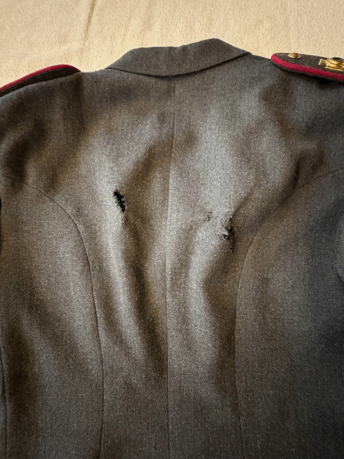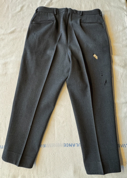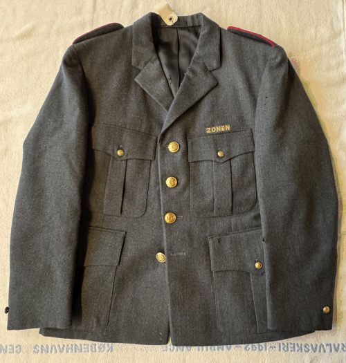 Grå uniformsjakke med pressede skuldermærker, fire store malteserknapper til lukning, små på ærmer og lommer, ZONEN broderet påsyet over venstre lomme, 1 par lange benklæder.