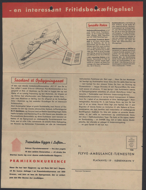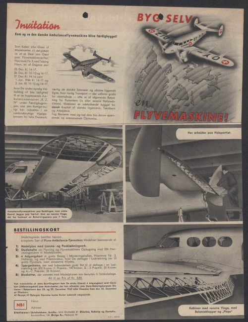 Invitation trykt i sort og rødt med billeder, tekst og grafik til at se OY-DIZ blive bygget færdig i Tuborg Havn i december 1943 og januar 1944