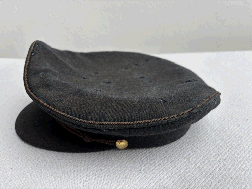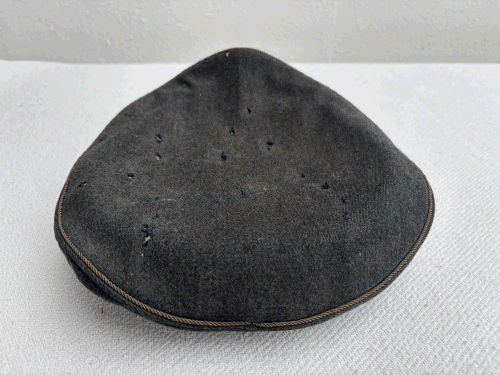 Grå Zoneleder kasket med stofskygge, bred dobbelt guldsnor, vævet maltzerkors i egeløv. Oval kokarde. Mærket Garodkin Gammel Kongevej 91 Kbhn. |
