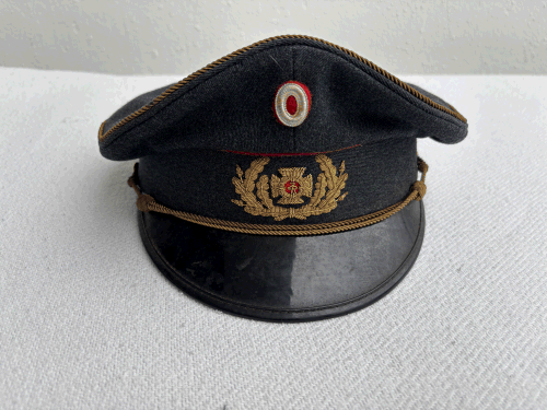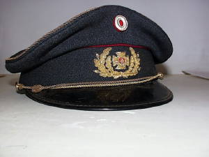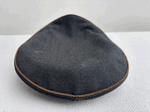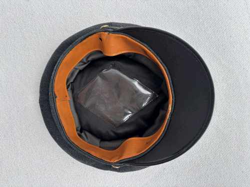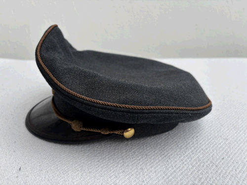 | Grå Zoneleder kasket med blank skygge, smal dobbelt guldsnor, vævet maltzerkors i egeløv. Guldsnor i øverste kant. Oval kokarde. |
